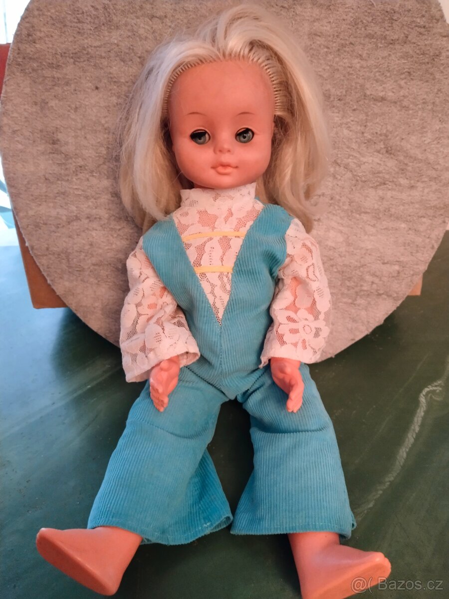 Velká retro panenka mrkačka - [13.2. 2026]Stará mrkací panenka, ruce a nohy pohyblivé. Používaná, hrála jsem si s ní jako malá (jsem ročník 1984), mírné nedokonalosti jsou znát - flíčky na oblečení, ztráta kalhot a dupačky nejsou originál od panenky. Jsou originál po mě :-), jinak je panenka ...