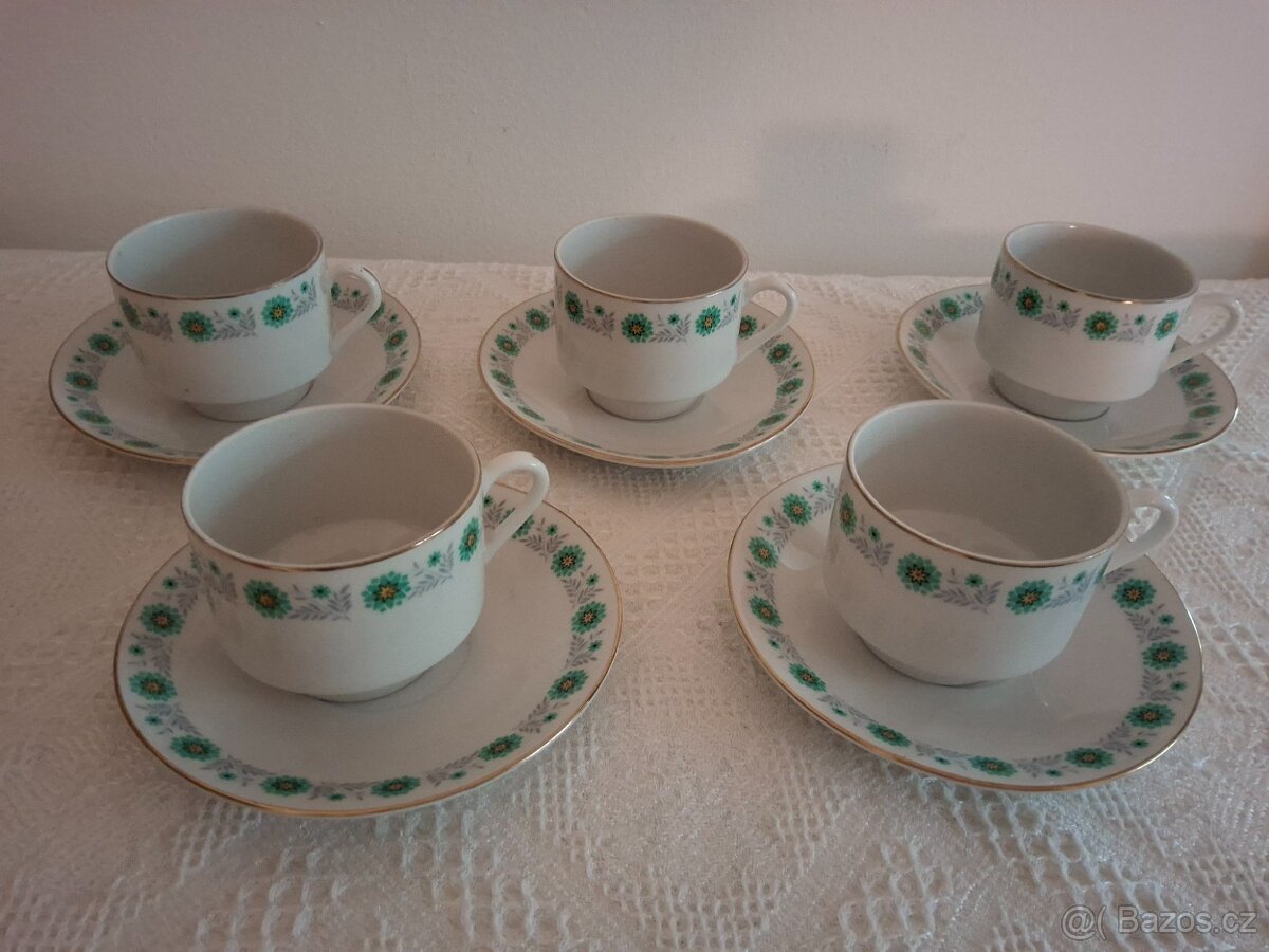 Prodám retro kvovou soupravu. 5 šálků s podšálky. Průměr talířku 12,8 cm, průměr šálků 6,5 cm, výška 5,5 cm. Bez vad/. Cena 229 kč. Posílám balikovnou za 75 Kč, nebo zasilkovnou za 89 Kč.