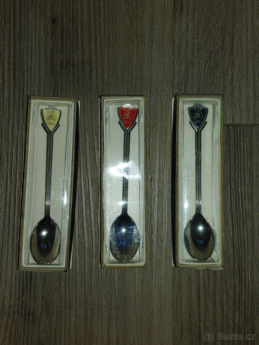 Prodám malé sběratelské lžičky v krabičkách již neexistující firmy Elektrotechnické závody Julia Fučíka. Jedná se o sběratelskou lžičku s kovovým znakem s textem "EJF BRNO". Cena za 3ks 200,-Kč.