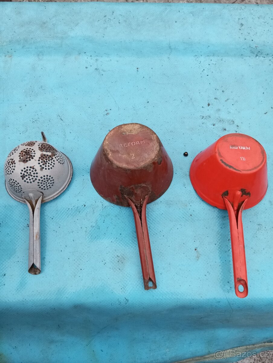 Dobrý den,prodám staré retro smaltované nádobí, šedý cedník 60 kč,hnědá naběračka 60 kč,červená naběračka 85 kč,mohu i poslat,jen volat nebo mejlem