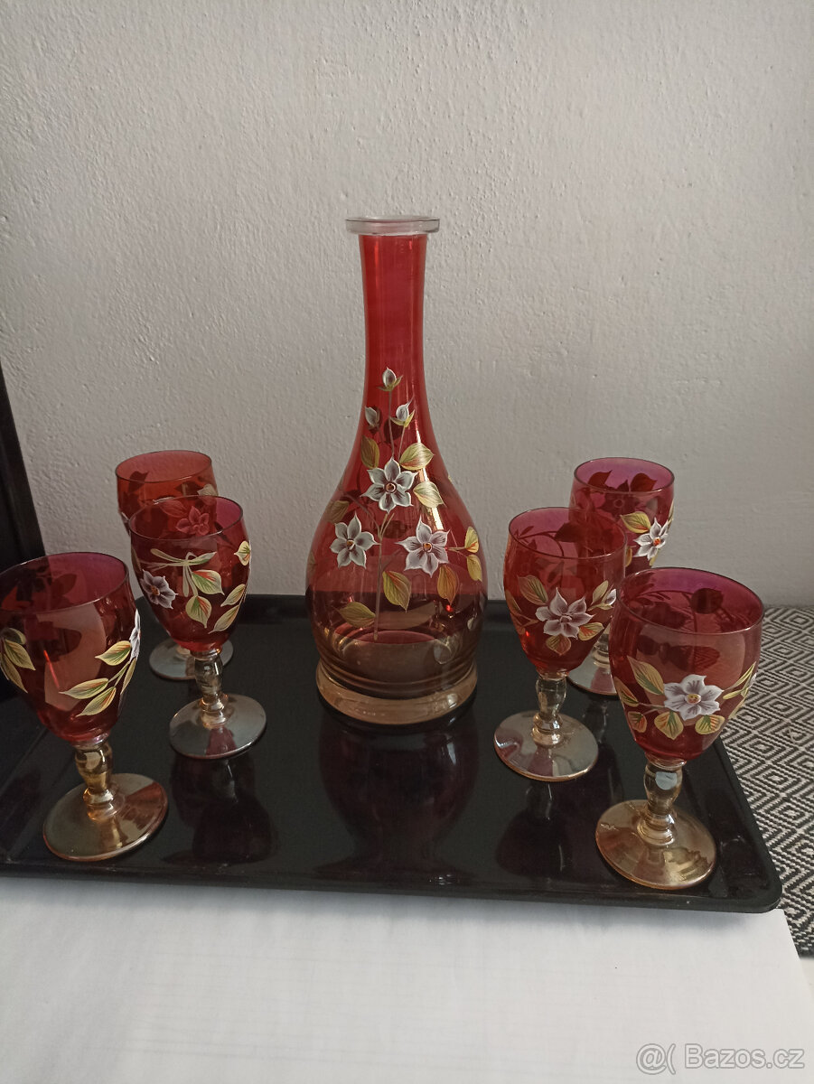 Prodáme rubínově červený, zdobený servis na víno včetně karafy. Obsah číší 1 dl, výška 15 cm, výška karafy 33 cm.