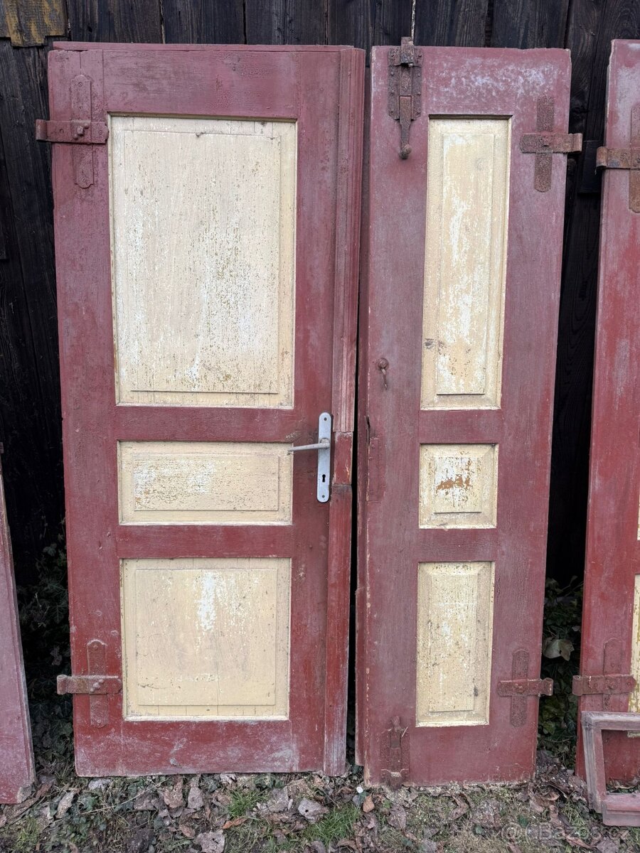 Prodám "sadu" historických starožitných dveří viz foto. Stáří cca 100 let. Jedno dvojité křídlo má i nadsvětlík.Cena k jednání