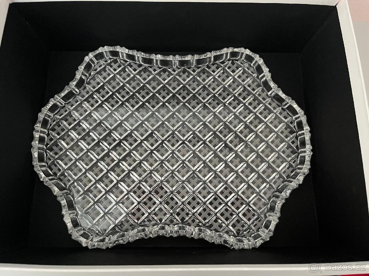 Prodám moc hezký skleněný lisovaný tác, ve všech kosočtvercích jsou vybroušené jemné muřinky.