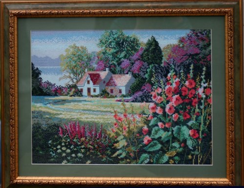 Obraz ručně vyšitý velmi jemným křížkovým stehem. Zaskleno a zarámováno v krásném rámu s barevně ladící paspartou.