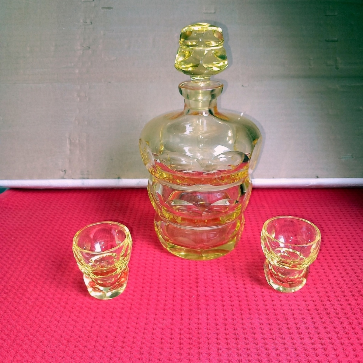 Skleněná karafa Moser s fazetami, broušenou zátkou a dvěma skleničkami, neznačeno, obsah 0,5 l, výška se zátkou 21 cm, bez zátky 16 cm, skleničky v=5,5 cm, Ø 4,5 cm, bez poškození.