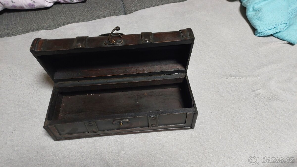 PRODÁM DŘEVĚNÝ OZDOBNÝ KUFŘÍK NA LÁHEV VÍNA. ROZMĚRY 36 x12x12 CM