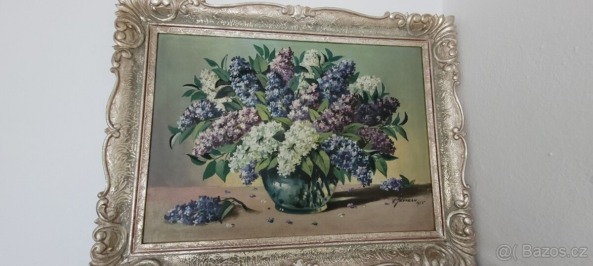 Nabízím obraz šeříků autora Karla Škovrana z roku 1955, ve zlaceném rámu. Rozměr obrazu je 64x84 cm.