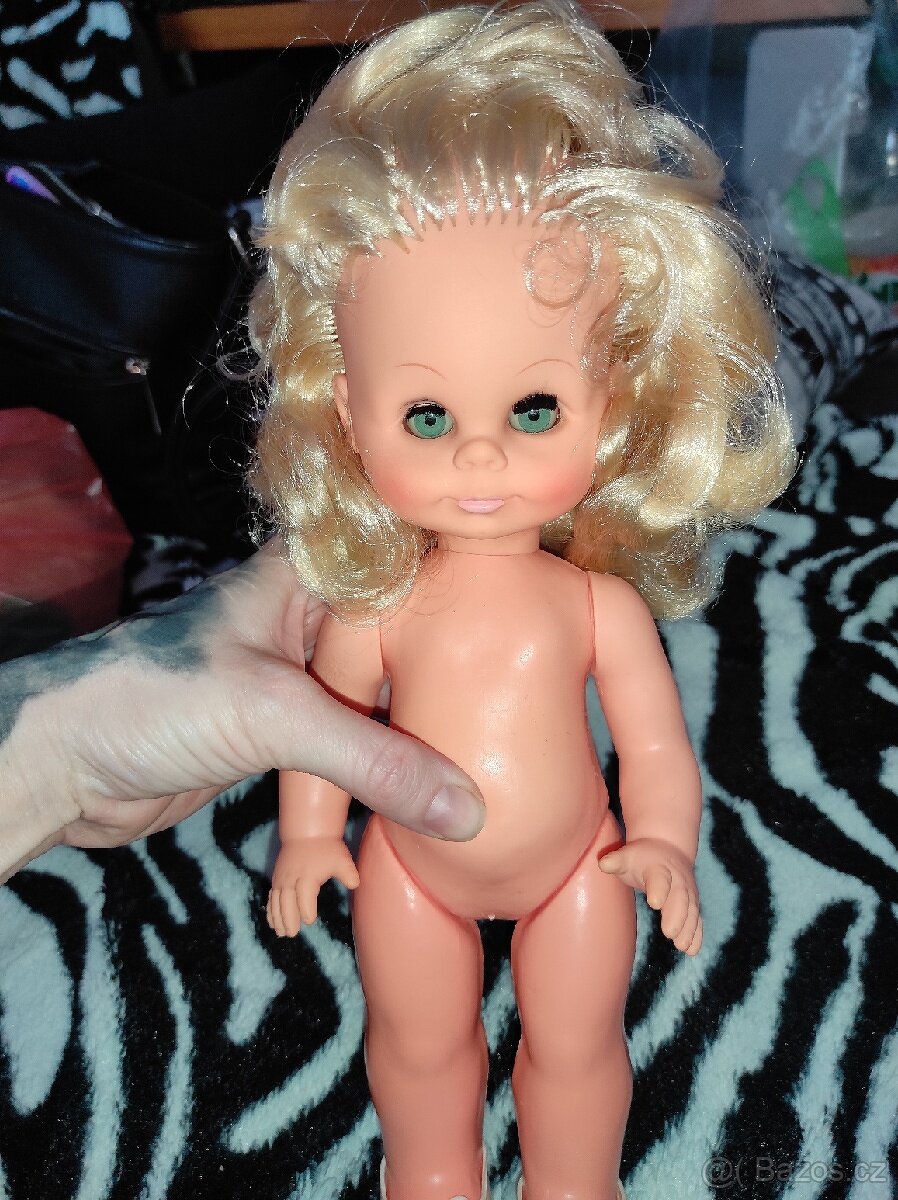 Hraná, na hlavě číslo 12 3406, tělo místy propícháno jehlou nebo špendlíkem, výška 27 cm