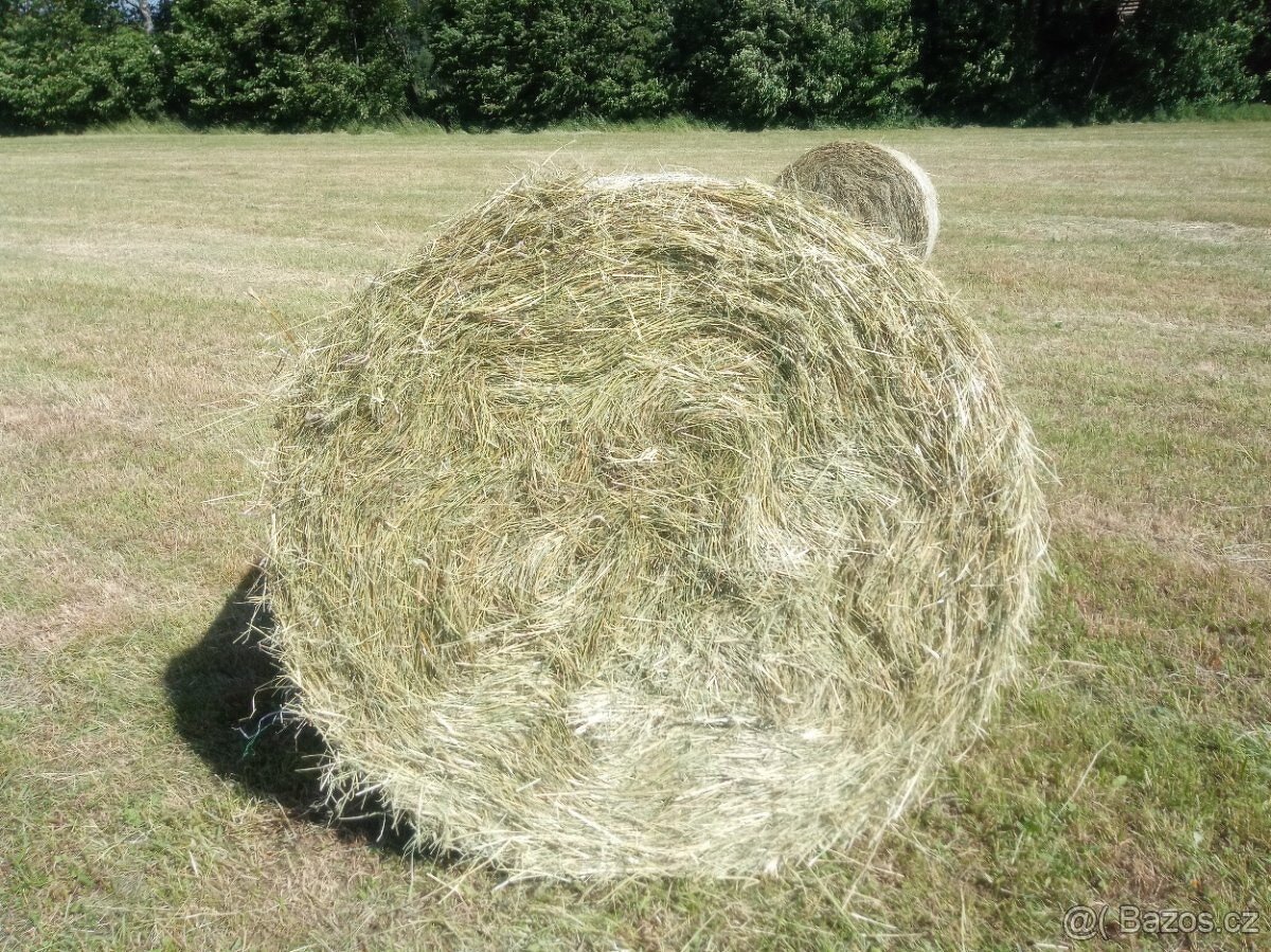 Prodám luční seno - lisované v kulatých balících 120 cm, sklizeň 2025, letní seč uskladněné v hale v suchu.