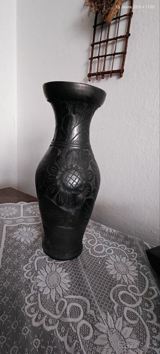 Prodám velmi pěknou černou keramickou vázu. Tato černá keramická váza má matný povrch a je zdobena plastickým vzorem květin a listů.