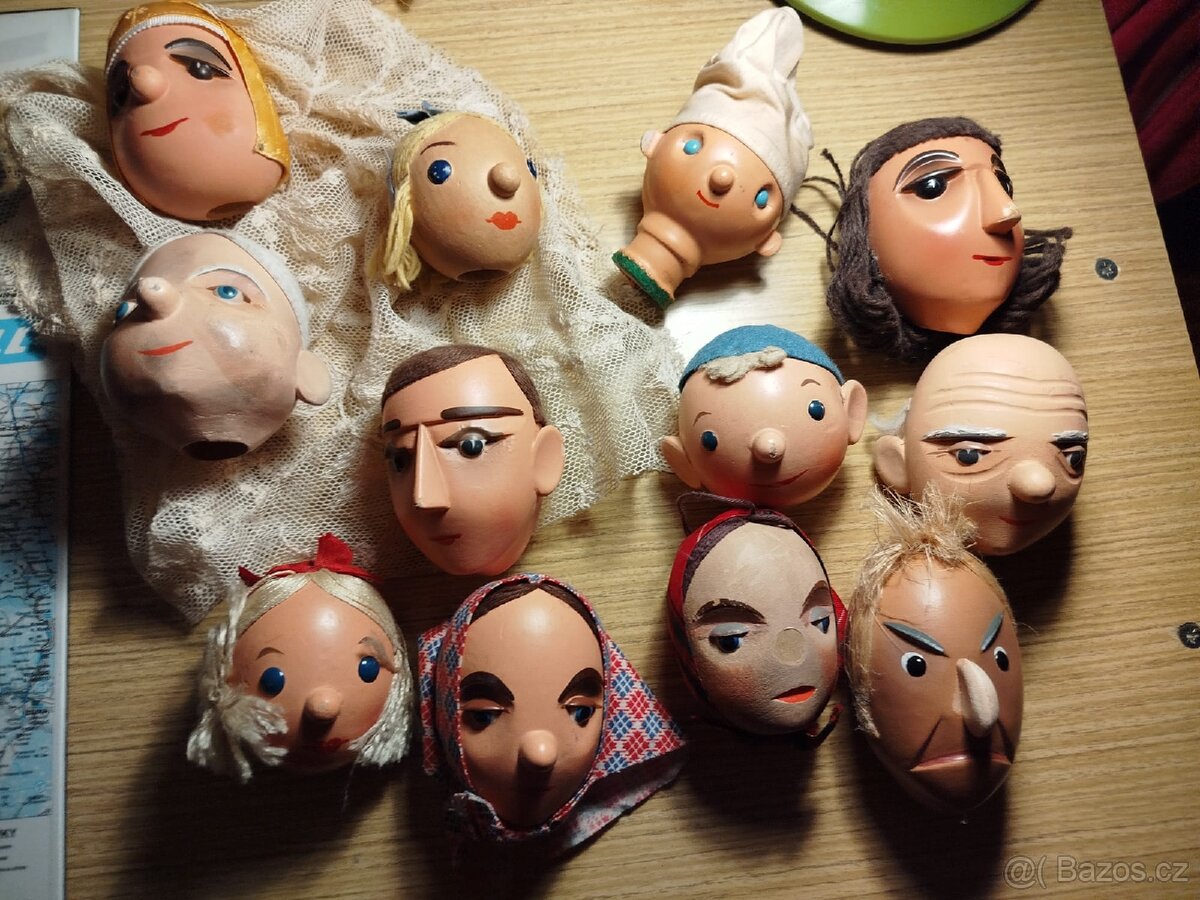 Prodám soubor 11 kusů náhradních hlav pro loutky (maňásky). Na rozdíl od moderních náhrad se nejedná o plast, ale o tradiční dřevo, což loutkám dodává váhu a autentičnost. Každá hlava má svůj osobitý charakter a výraz.
