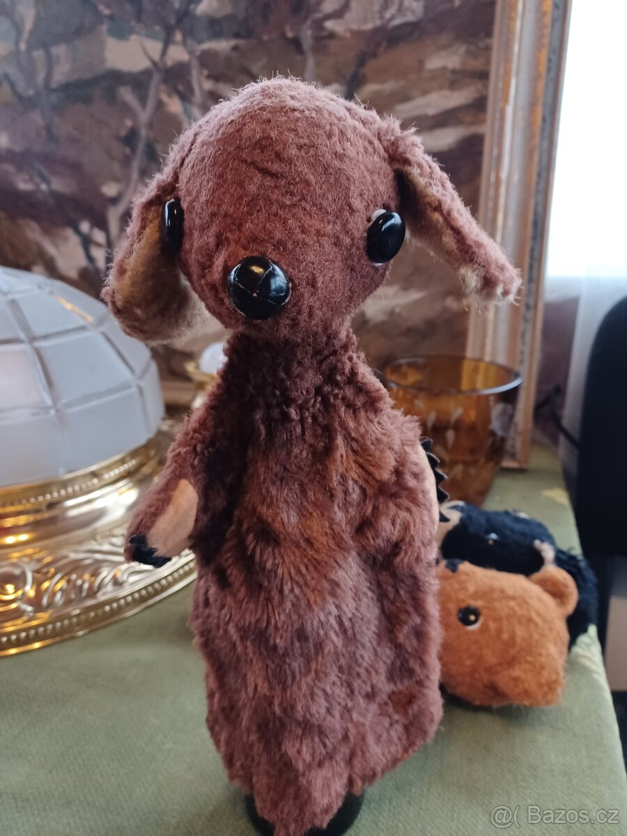 Maňásek na ruku v původním stavu, bez poškození od molů nebo čehokoliv jiného. Vyrobeno kolem roku 1960. V dalších nabídkách mám jiné postavičky. Skleněná očíčka i čumáčky nejsou oťukané.