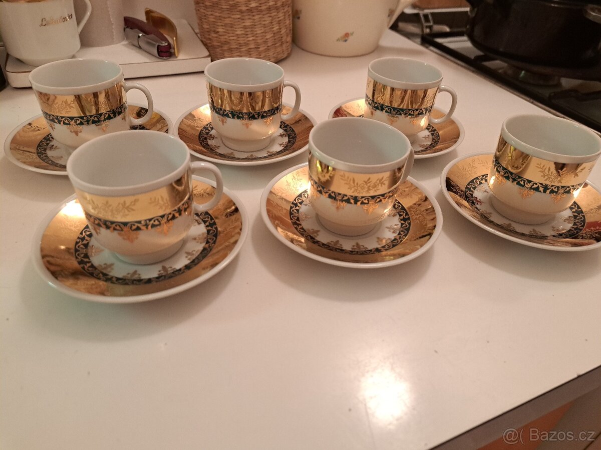 Elegantní porcelánová sada šesti šálků s podšálky z karlovarské porcelánky Moravia (provozovna Loučky). Set je zdoben výrazným tyrkysovým/tmavě zeleným pásem s jemným zlatým ornamentem a bohatým zlacením vnitřků šálků i uší.Typický kvalitní československý porcelán z druhé poloviny 20. století.