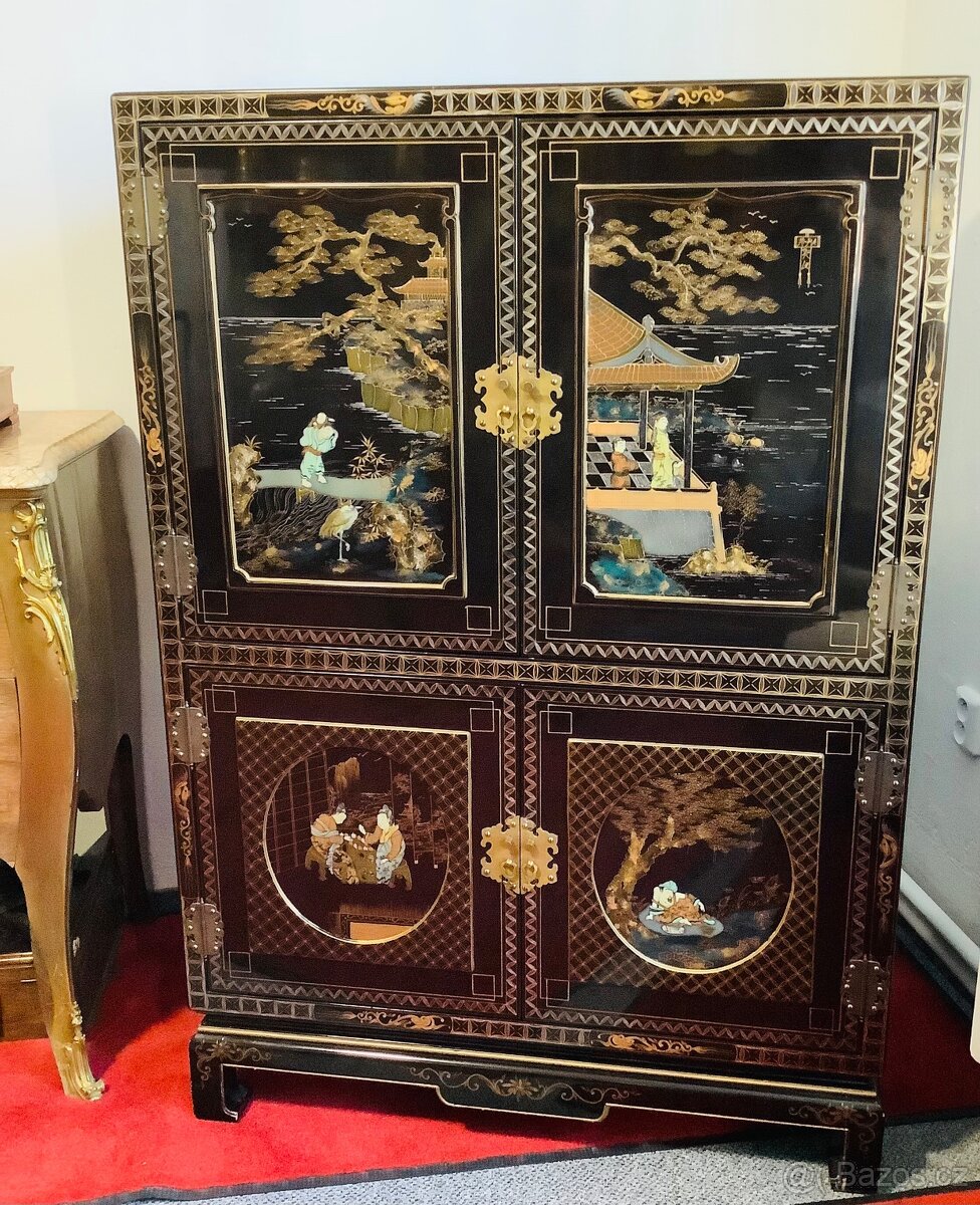 Starožitná Čínská komoda v originál a původním ojedinělém stavu, ručně malovaná a zdobená. Rozměry: výška 145cm šíře 99cm hloubka 99cm