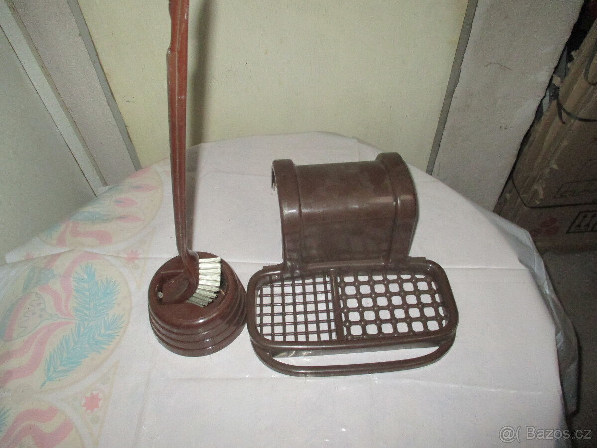 Prodám hnědou WC soupravu -štětka s miskou a držák na vanu na mýdlo,nové.