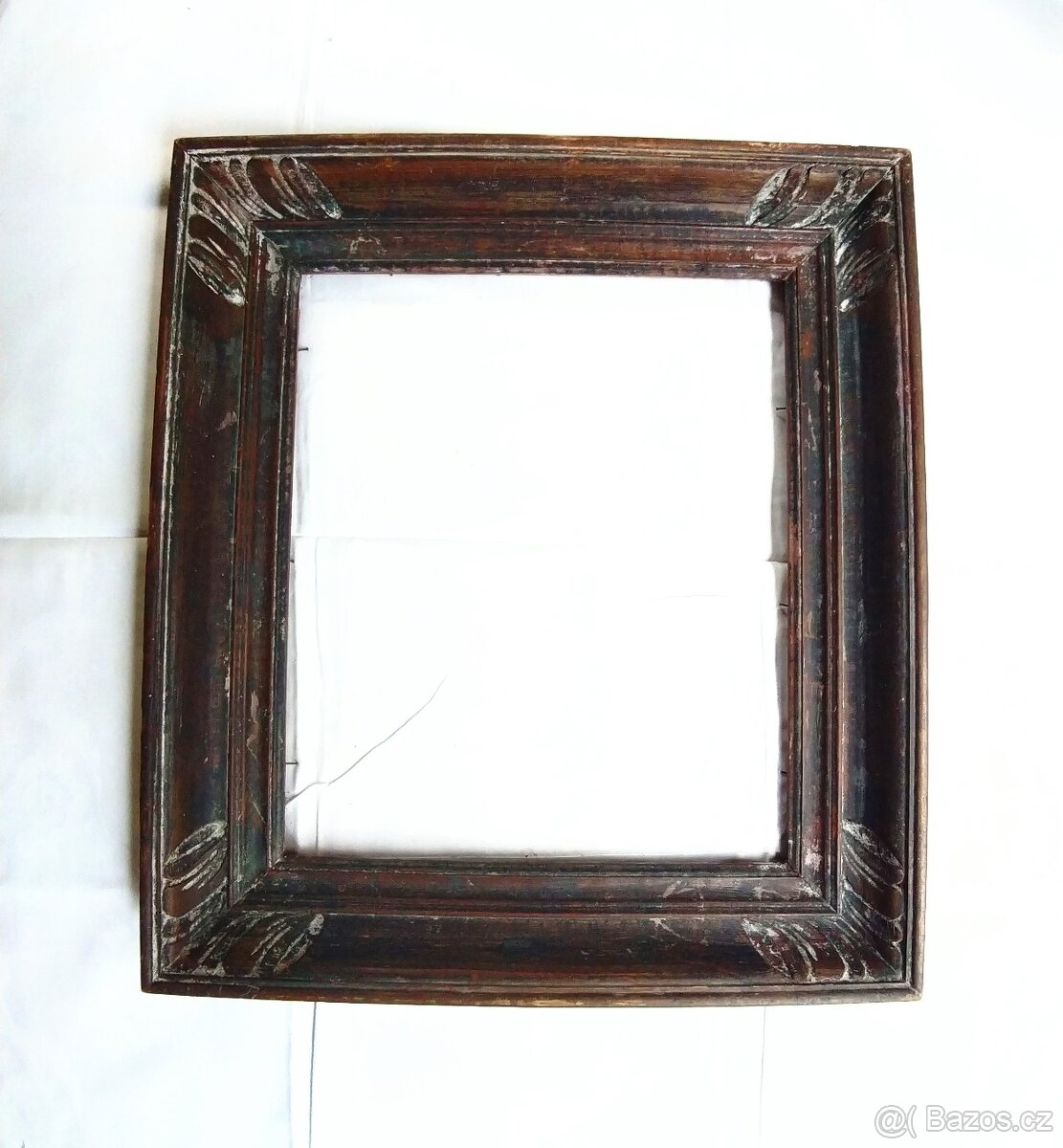 Starý hnědý rám se vzorem v rozích a krásnou patinou, vhodný i do vintage a etno laděné domácnosti, na obraz či zrcadlo, původní sklo součástí, stáří přes 100 let. Rozměry: výška 51 a šířka 45, vnitřek výška 37 a šířka 31,5 cm. Velmi dobrý stav, zaslouží si výživu olejem ap.