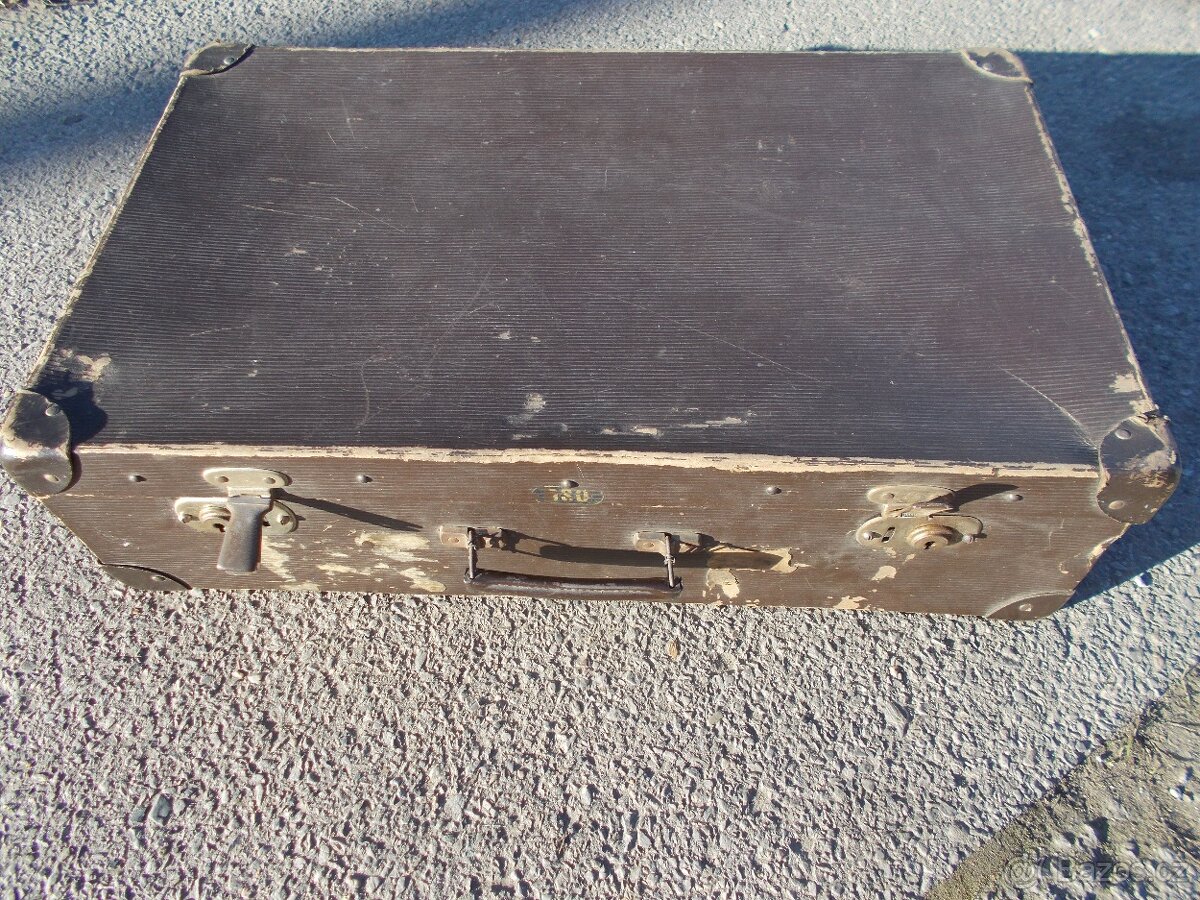 Prodám starožitný 100 let starý papírový kufr, vyztužené rohy, ucho původní kovové, nefunkční horní část uzávěrů, Kazeto Eso.