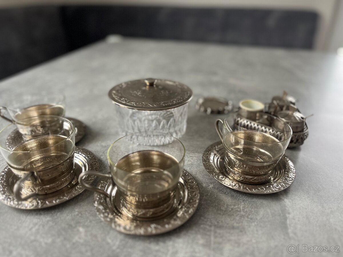 nabízím krásný retro čajový/kávový servis ze skla v kovových držácích.