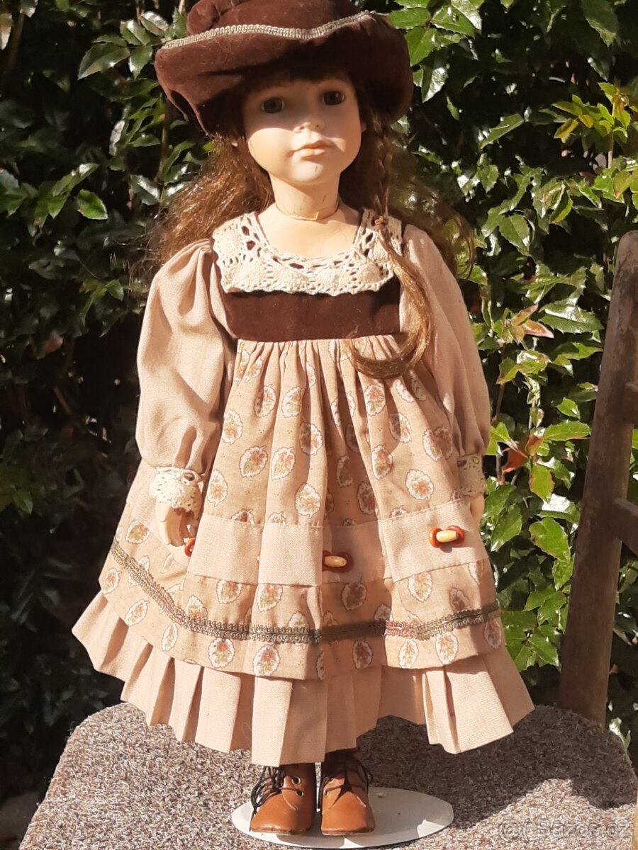 Na prodej mám tuto nádhernou panenku v šatičkách,kloboučku a s kabelkou.Je na stojanu.Ma porcelánovou hlavičku a ramínka.Na krku ma prasklinu,která ale nema na funkci vliv.Vysku ma 55 cm.Má krásně vymodelovaný obličej.Je líbiva.Výrobce a staří nevím.Nevyznám se v tom.Dost jezdím,takže můžu i někam dovést.