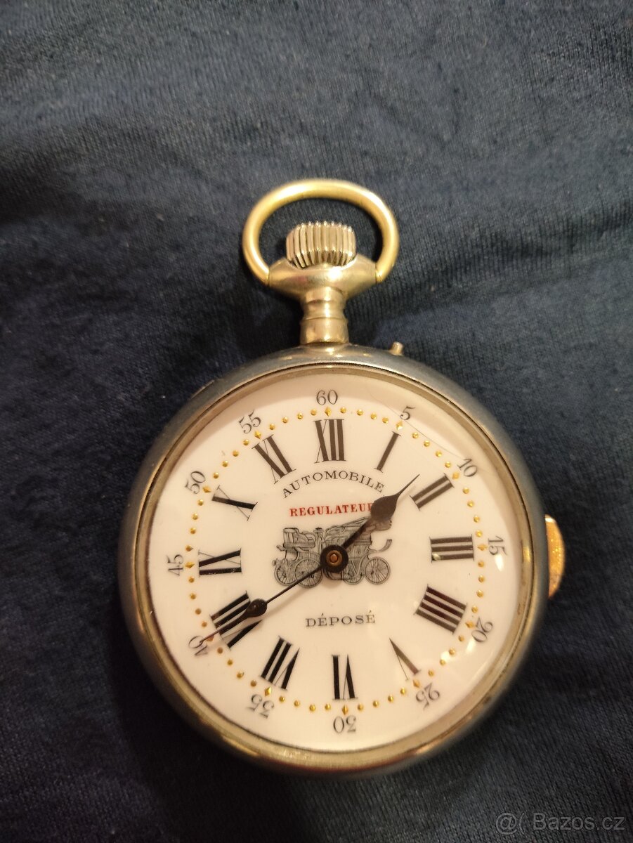 Velké+průměr 65mm bez oblíku, 167g) kapesní hodinky, čtvrťové bití, na ciferníku automobile regulátor, funkční, neotlučené