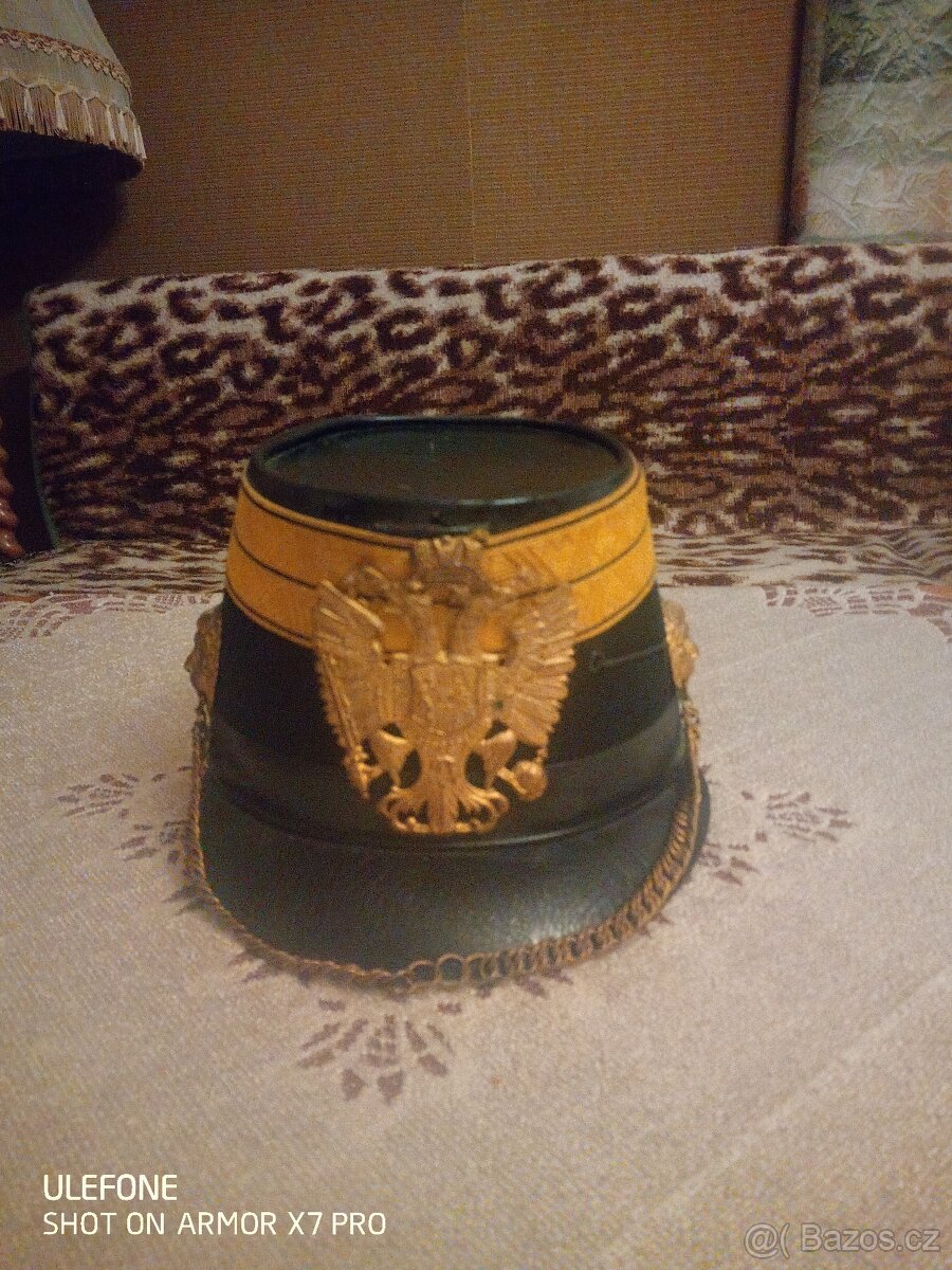 Vojenská čepice Rakousko - Uherské armády. K čepici náleží i kožený kufřík pro její uložení