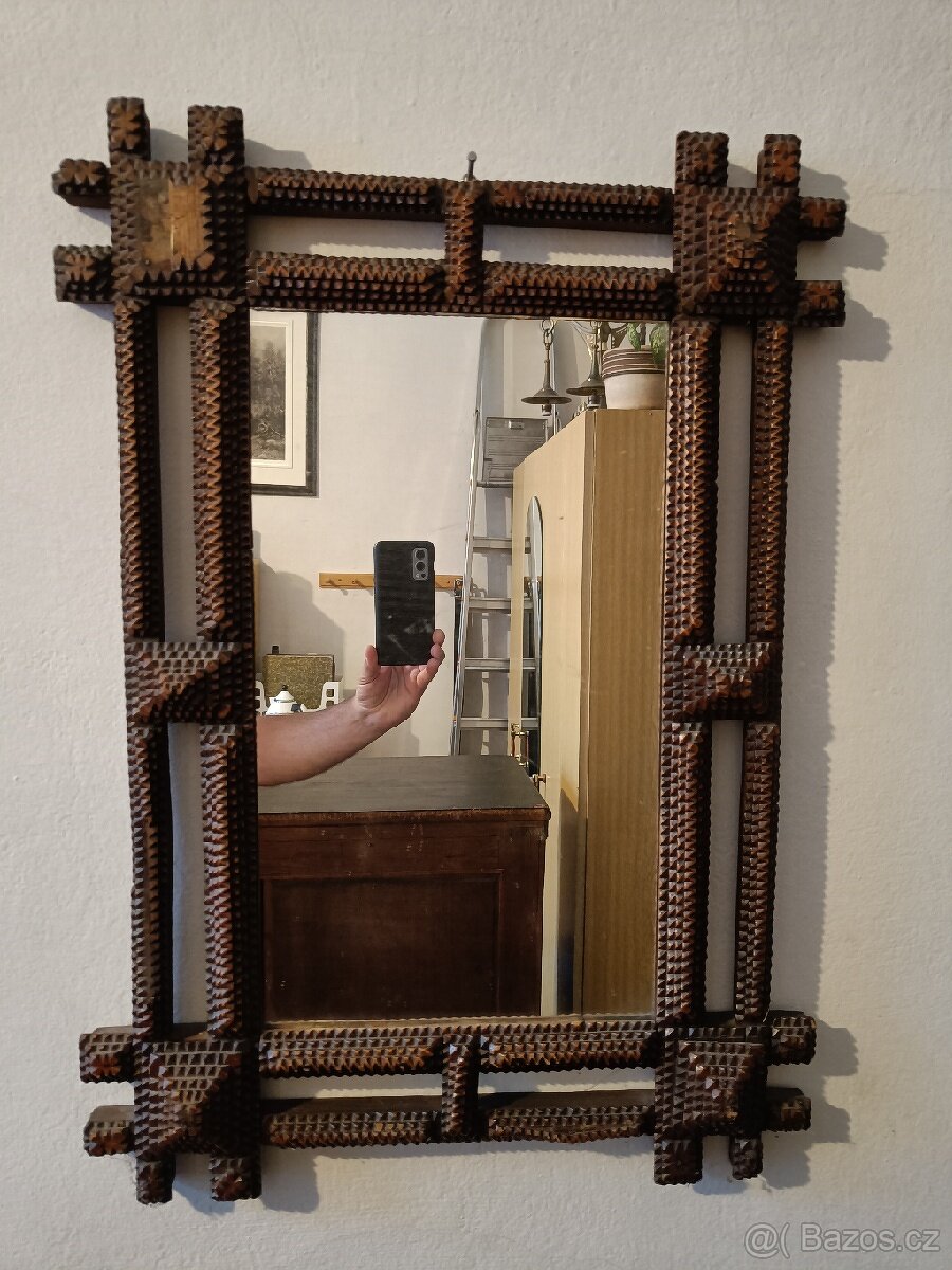 Prodám starožitné zrcadlo v dřevěném vyřezávaném rámu 70x48. Poškozené v levém horním rohu. Ulomený kus viz foto.