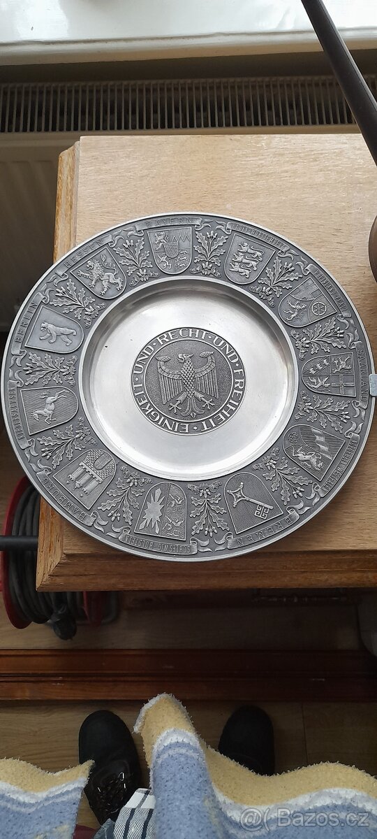 dva cínové talíře na pověšení menší za 250 Kč a větší za 600 Kč