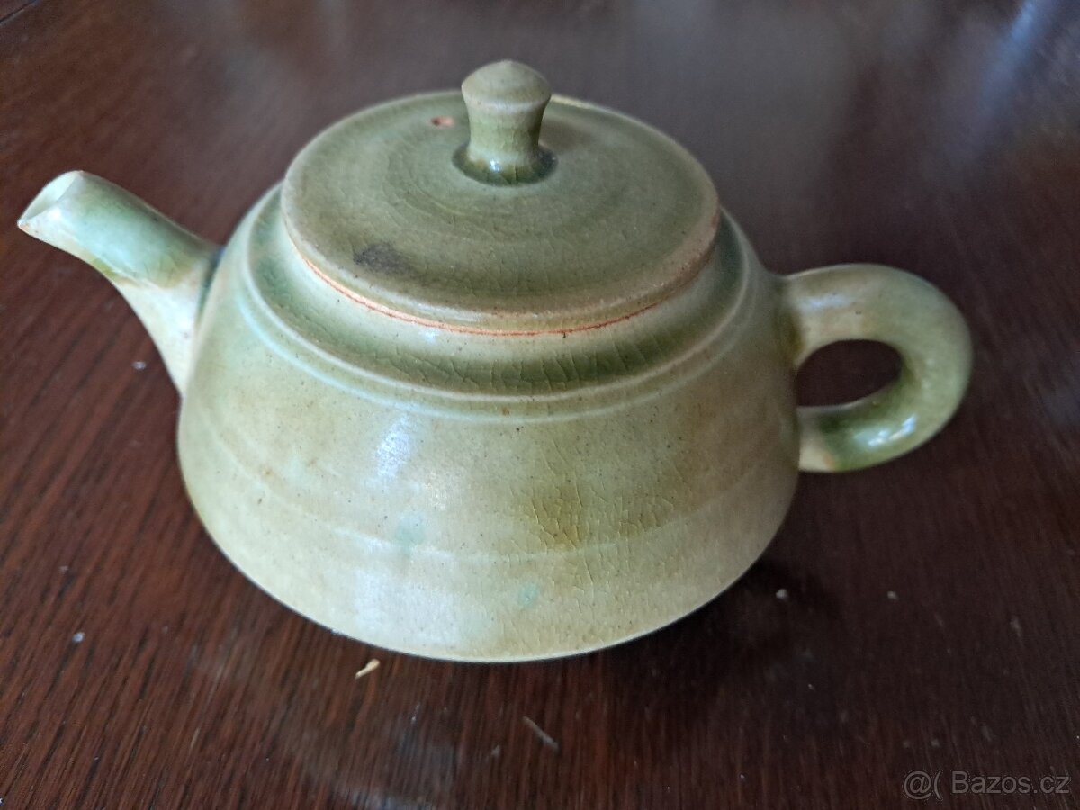 Malá zelená keramická konvice. Přibližně 300 ml.
