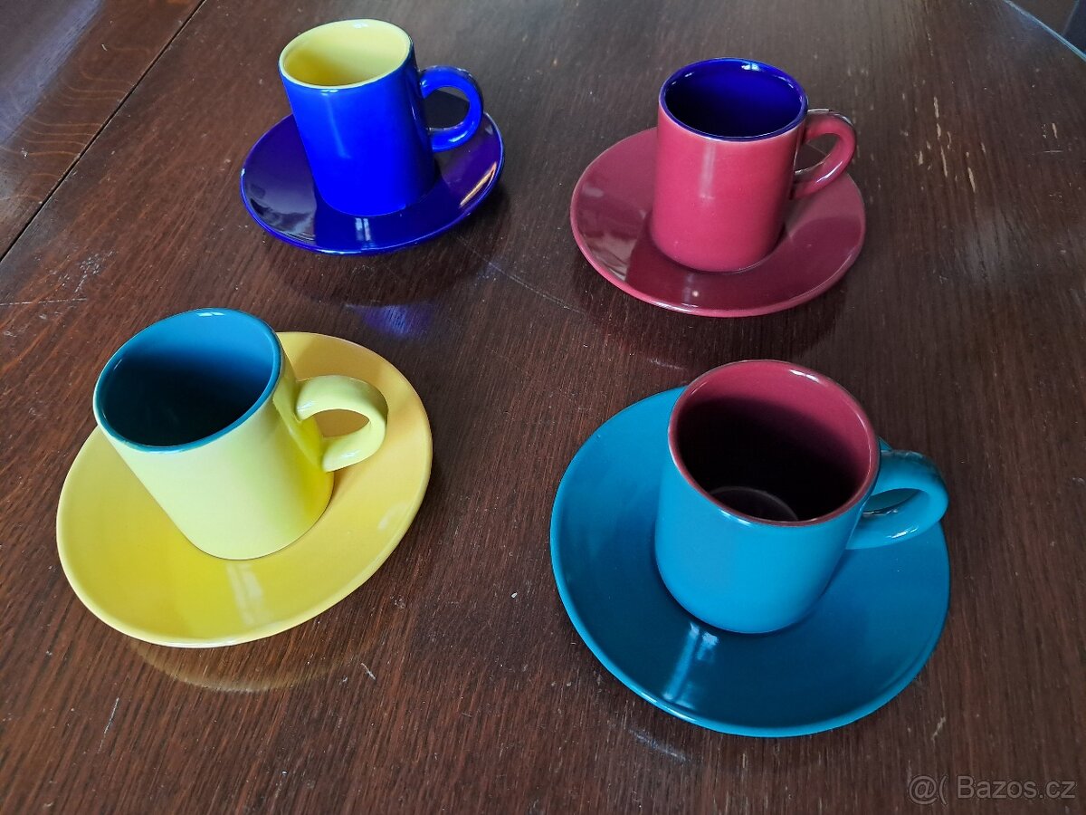 Kávová souprava retro - [20.2. 2026]Retro používaná kávová souprava, 4 šálky, 5 podšálků, džbán. Na fotce chybí ještě větší džbán a cukřenka, v případě zájmu pošlu zbytek fotek. Barevné proužky částečně vymyté.