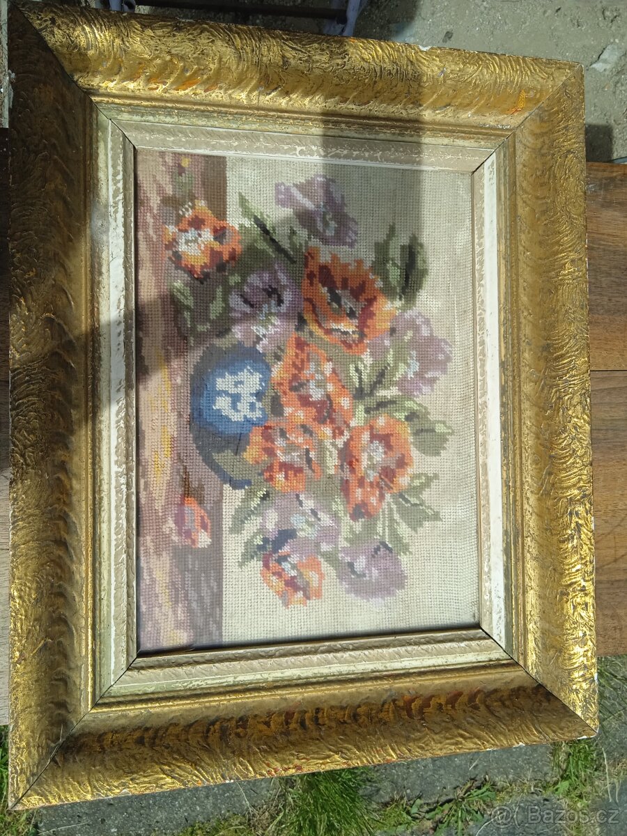 Prodám retro vyšívaný obraz v proskleném rámu, obraz je starý víc jak půl století,viz foto.