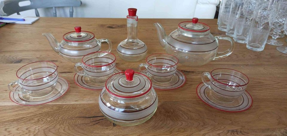 Popis: Souprava čajová, laboratorní sklo s červeným lemováním ve stylu Funkcionalismu, designer: Ladislav Sutnar, obsahuje: 1 x konvice čajová, 1 x mlékovka, 1 x cukřenka, 1 x karafa na rum, 4 x šálek, 4 x podšálek