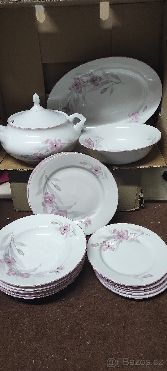 Retro polévková souprava 23 kusů, 6+6+6 talířků, hluboké jsou prijemně hluboké, na jednom plytkém talířku mini oťuk viz fotka. Mísa, mini mistička,velký oválný a velký kulatý podnos, polévková mísa s víkem. Nová. Značka Thun-Czechoslovakia-Angelika.