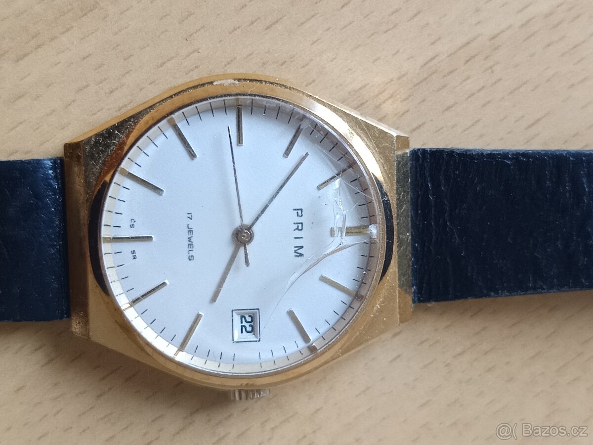 Staré funkční, pánské pozlacené hodinky Prim , - [29.3. 2026]Staré funkční, mechanické pánské pozlacené hodinky Prim , průměr bez korunky-34mm, ,hodinky mají 17 jewels, mají pozlacený převlíkací řemínek- je vyčištěný, sklíčko je nové, hodinky jsou funkční- přesnost a rezerva nátahu neměřena- více viz, fot ...
