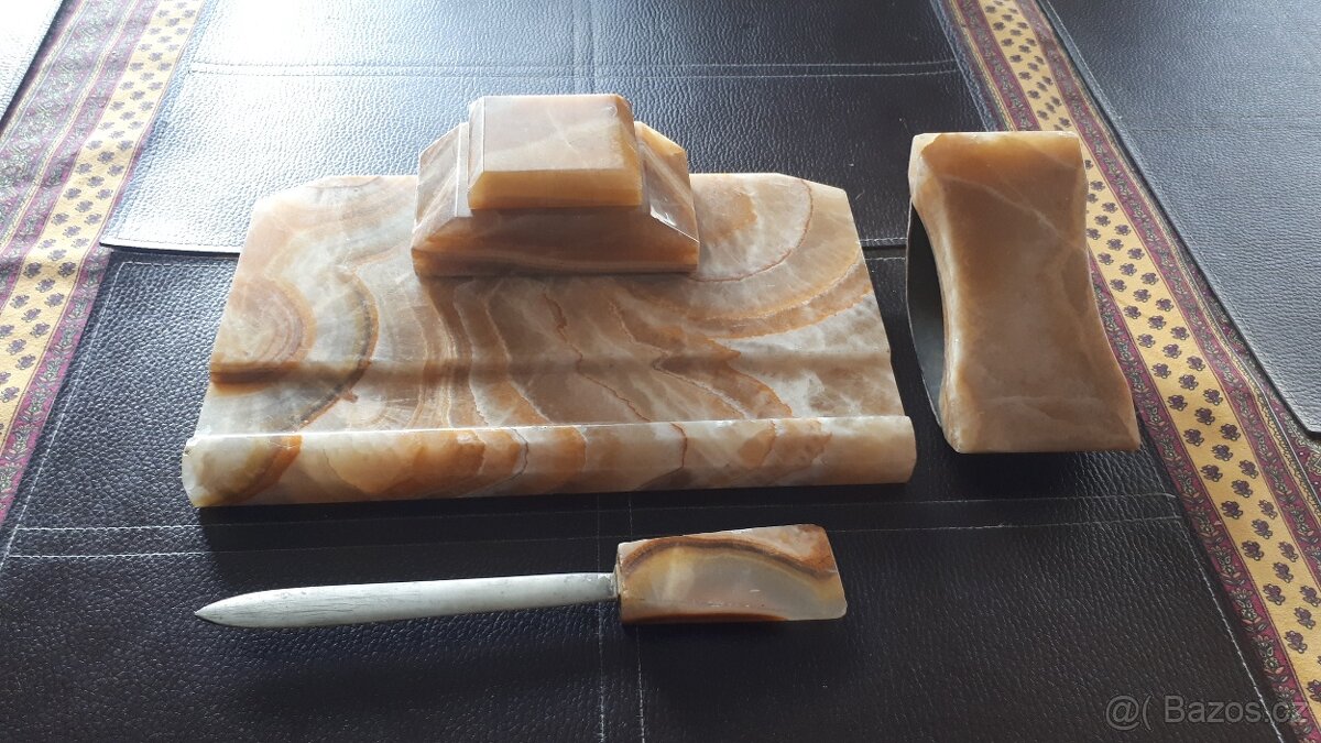 Mramorová psací souprava z 1. republiky - [28.1. 2026]Mramor nepoškozený, chybí skleněné dno náplně na inkoust, délka 28 cm.