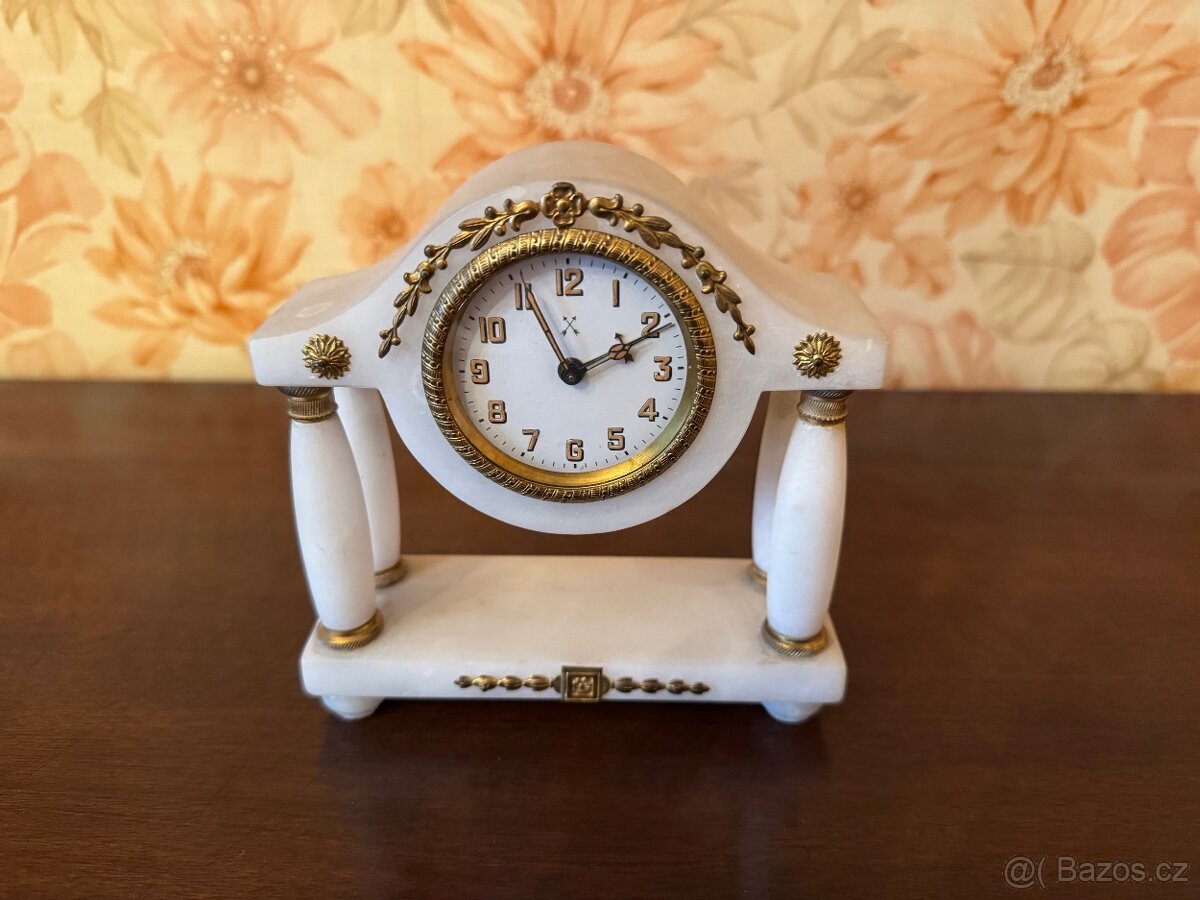 Prodám stolní empírové, alabastrové hodiny v krásném stavu (viz. foto). Strojek nutno vyčistit a promazat.