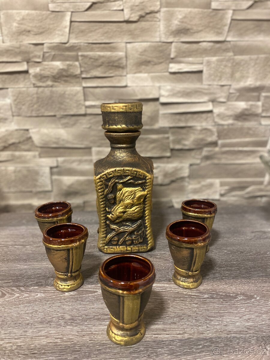 Ide o masívnu keramickú fľašu o objeme až 2 litre v unikátnom štýle, doplnený o päť keramických pohárikov po 100 ml.