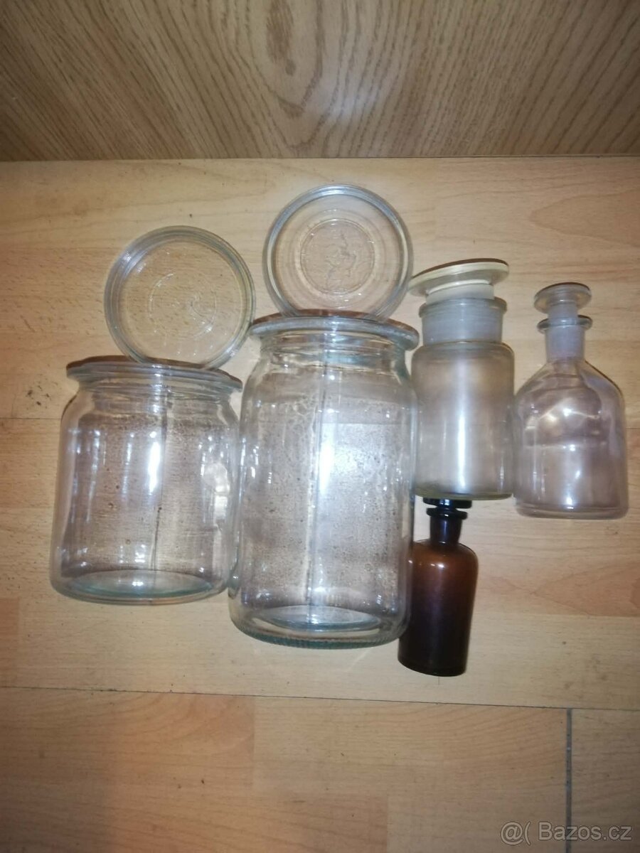 Prodám kvalitní staré lékárenské lahvičky a dvě skleněné staré dózy - výška 19cm a 14cm