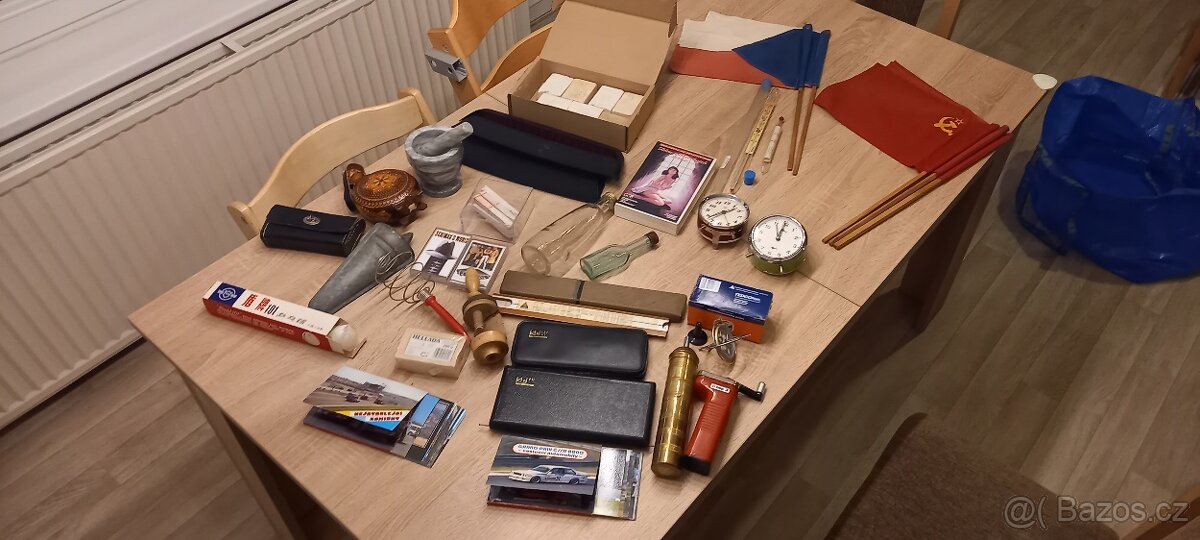 Pingpong míčky, Kreslící sady KIN kružítka, brousek s pouzdrem Rival prací prostředek, hellada mýdlo Budíky PRIM, Mlýnky , Mlýnek Tramp, audiokazety Queen a Scatman brzdová světla VW rýsovací pravítko, káča kovová, staré teploměry, videokazeta se starým filmem, staré křídy
