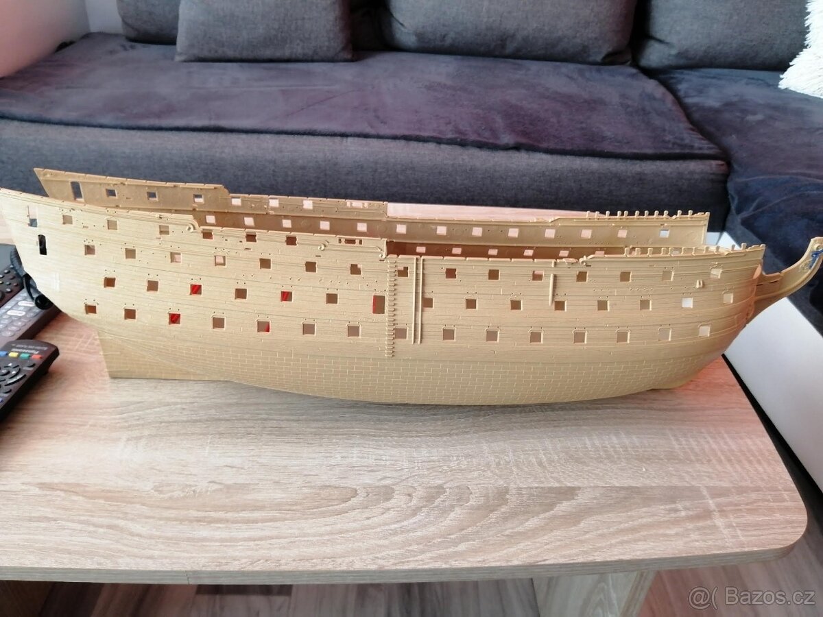 Je to dílo které jsem stavěl dva roky. Loď má kovové dělá 112ks, dřevěná paluba dub, lafety dřevo a kladky ořech, konopné provaty, kotevní lano, kovové kotvy se dřevem, platno plachty na cnc, světla l cerny plus podpalubí 50 světel . Podstavec dřevo má výroba . Doplňky sudy, kýble , řetězy , vstup boční , dělové koule. Vlajky látka . Model stál 4500 doplňky 14000.