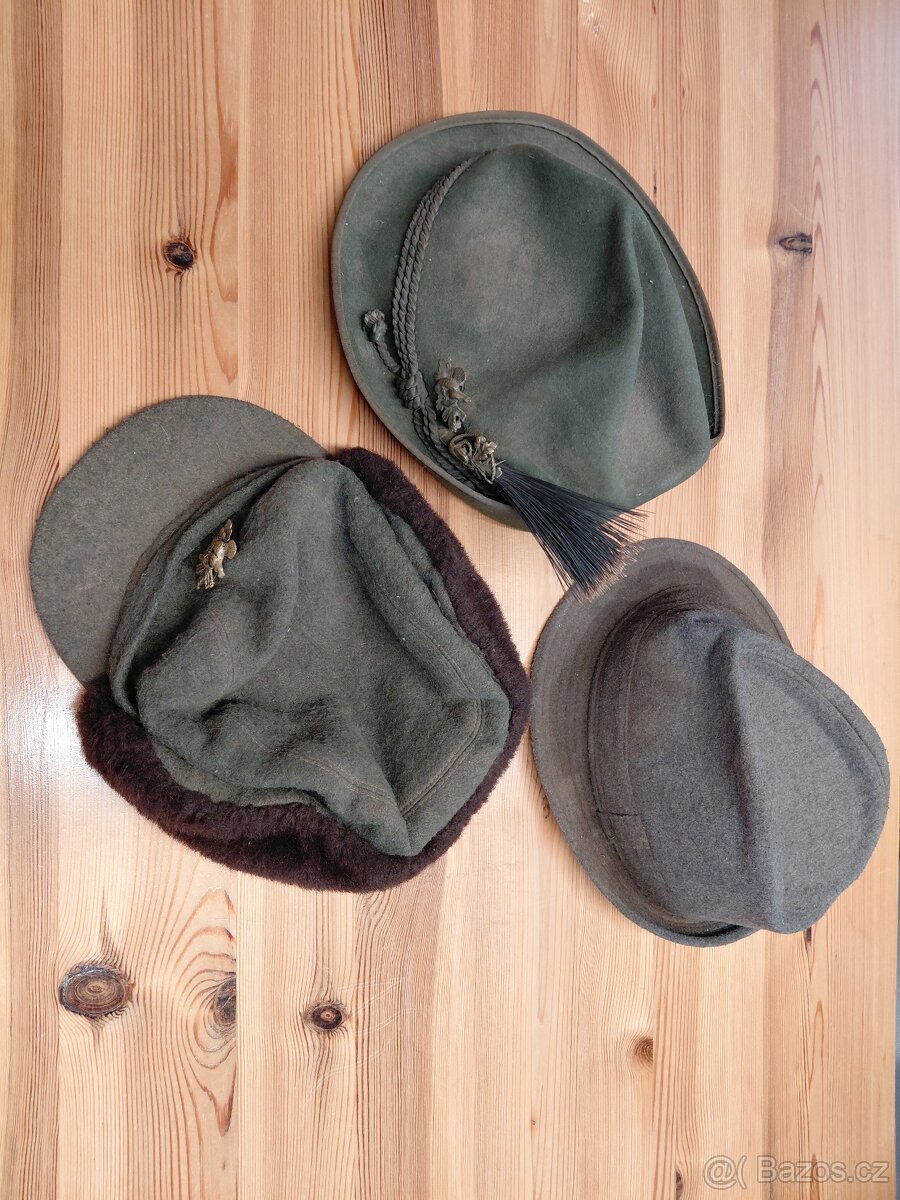 Prodám staré myslivecké klobouky, včetně pěkných odznaků, původní stav, nečišteno, stav dle foto.