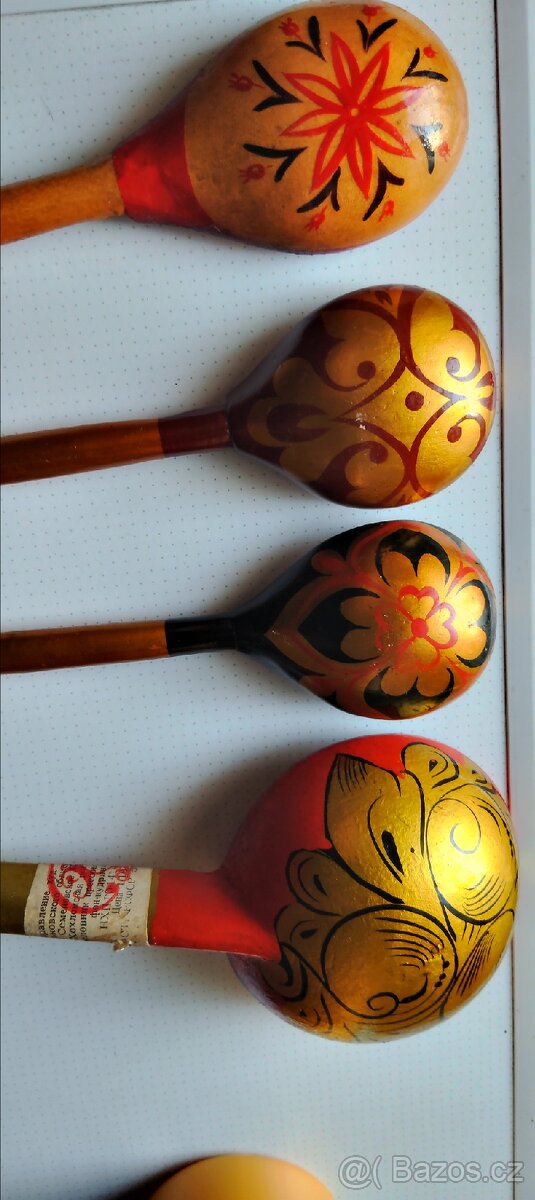 Dřevěné ručně malované lžíce SSSR, super stav viz fotografie, nepoužívané, jedna velká naběračka a tři menší lžíce každá jiný motiv krásná ruční práce, celkem 4 kusy
