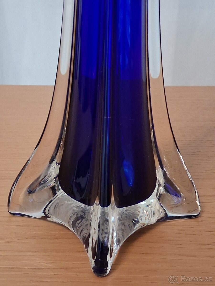 Nabízím k prodeji vázu vyrobenou se sytého modrého skla tzv. kobaltového skla. Základna se speciálním detailem a z čirého skla má i svoji váhu, teda vytváří stabilitu. Váza je v dobrém stavu a možnost využít i služeb Zásilkovny.