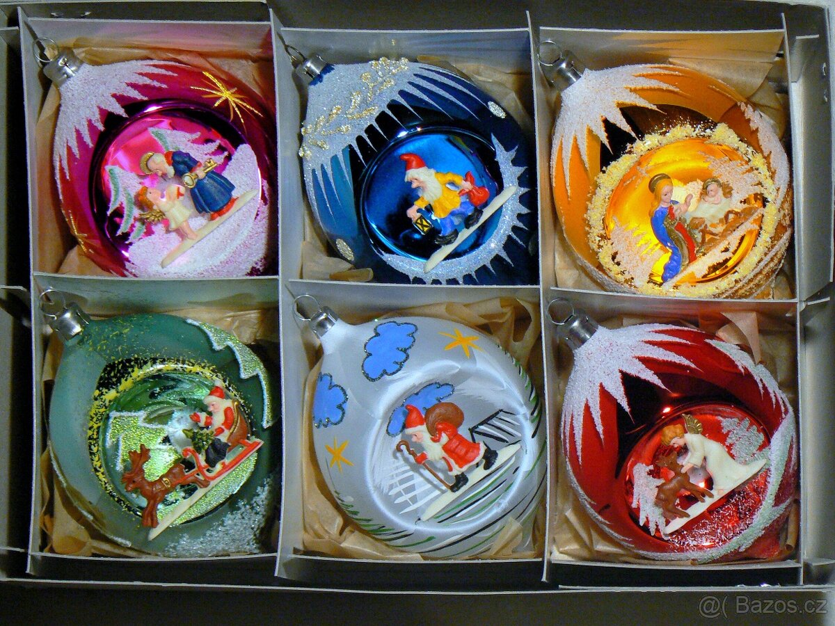 skleněné vánoční ozdoby s vlepem figurek-70. léta, cena za sadu, bez poškození