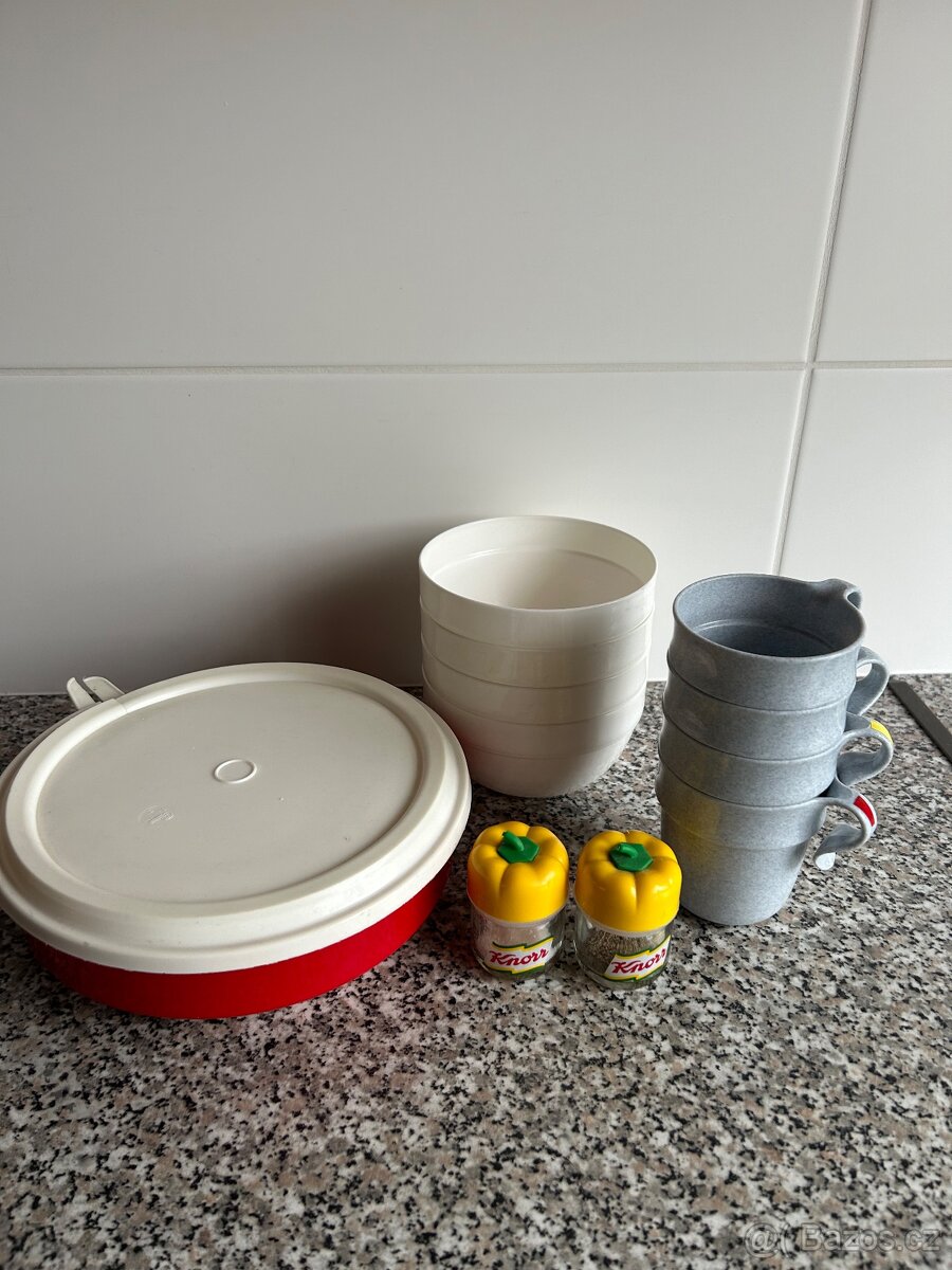 Prodám cestovní nebo piknikovou sadu nádobí z plastu, červená mísa s vikem, v mise jsou 4 talíře hluboké, 4 plýtké, pak jsou 4 bílé misky, 4 šedé hrnky, kořenky k setu zdarma