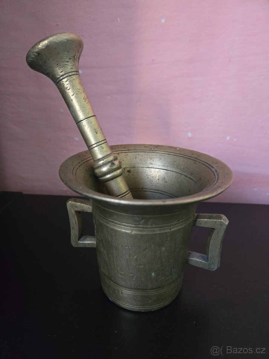Prodám starožitný mosazný hmoždíř s trdlem. Jedná se o dekorativní - funkční historický předmět v původním stavu. Výška cca 10,5 cm , vrchní průměr 11,5 cm, dno 6,5 cm, trdlo 17 cm.