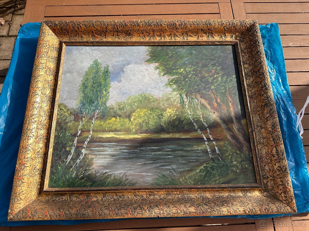 Olej na dřevěné desce, 60×49 cm (bez rámu), starší zdobený rám. Pozlacený. Stav: viz foto – drobné dírky/stopy po červotoči.“Oblast podkrkonošší.