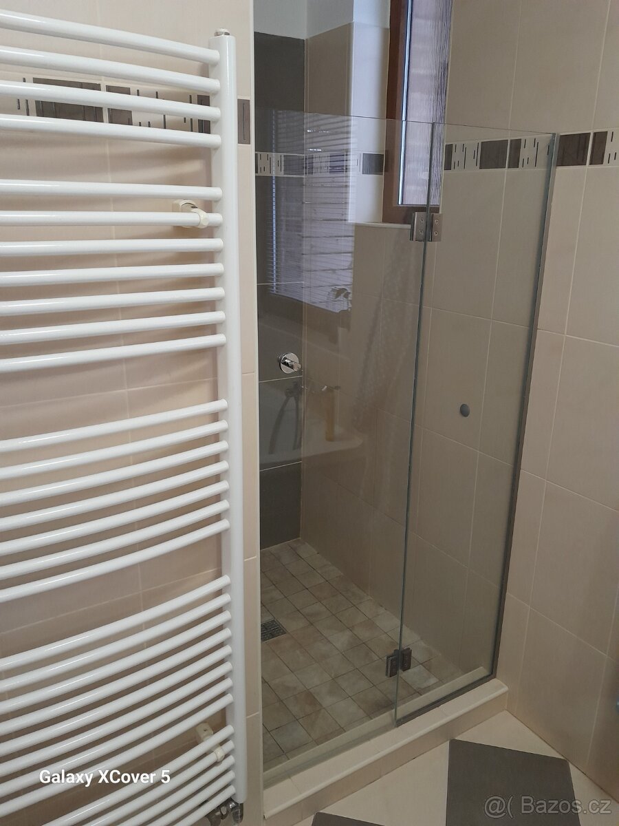 Set vybavení koupelny vana rohová 180,umyvadlo 45,dveře skleněné do sprchy 85,radiátor žebřík 70