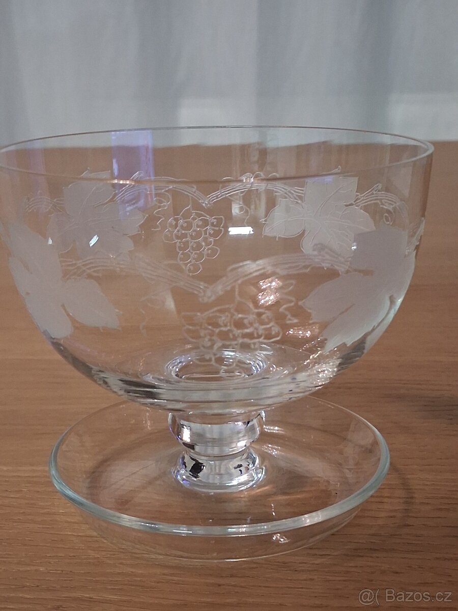 Nabízím k prodeji 5 Ks skleněných dezertních misek v retro stylu a s rytým motivem vinné révy. Misky jsou na na nožkách ktere jsou ted žádané. Obrženo v 80 letech. Misky jsou v dobré kvalitě, bohužel jen 5ks a možnost využití služeb Zásilkovny.