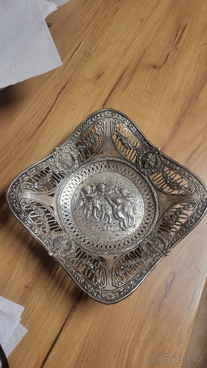 Luxusní prořezávaná stříbrná miska na ovoce. Nádherný plastický dekor, práce z poloviny 19. století. Miska je puncována lotovým puncem a rytou dedikací, která je pozdější.Mísa je v perfektním stavu, nepoškozená. Stříbro ryzosti 800/1000.