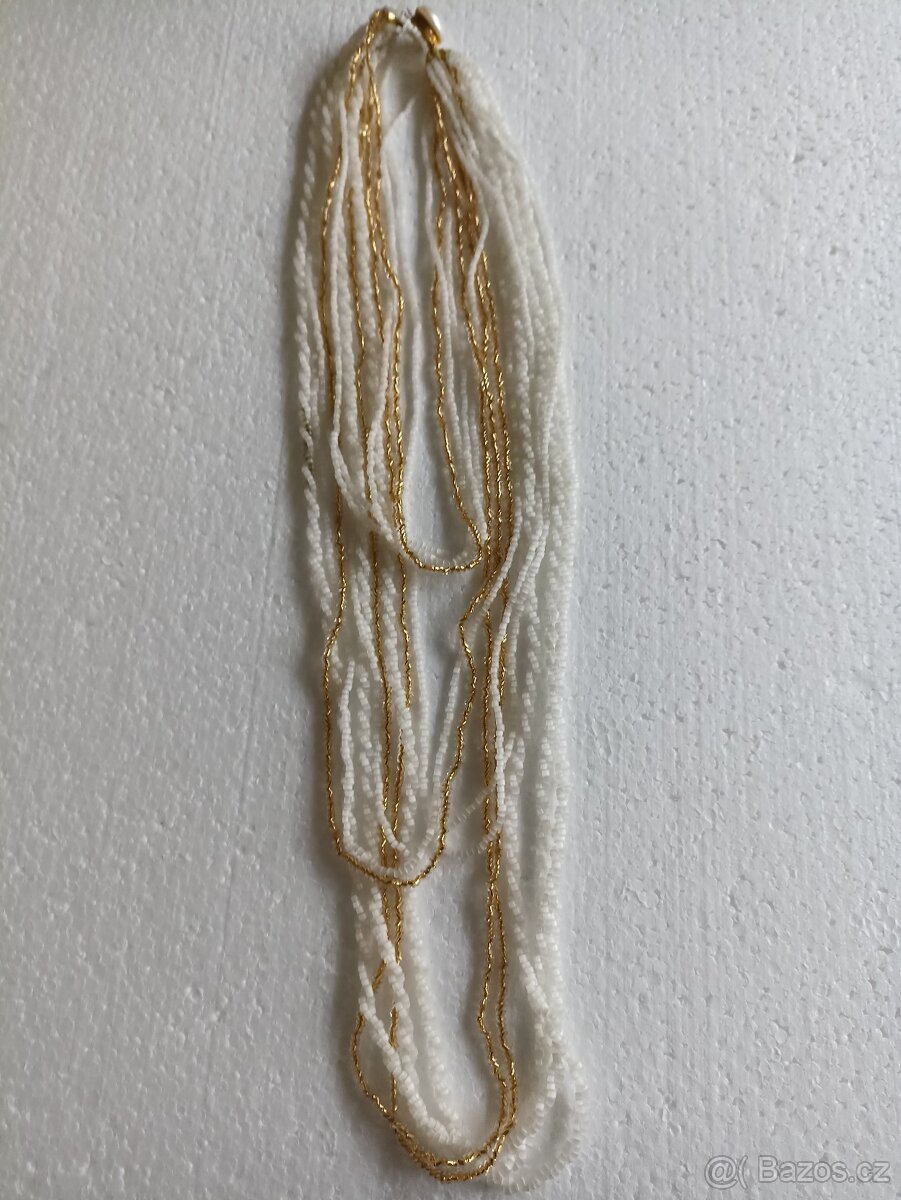 Velmi hezký 13-řadý náhrdelník ze zlatého a bílého rocailu, s ozdobnou perličkovou záponkou.